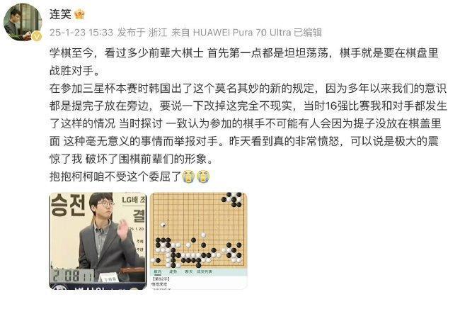 全程关注柯洁比赛的好友连笑表示:“学棋至今,看过多少前辈大棋士 首先第一点都是坦坦荡荡,棋手就是要在棋盘里战胜对手。在参加三星杯本赛时韩国出了这个莫名其妙的新的规定,因为多年以来我们的意识都是提完子放在旁边,要说一下改掉这完全不现实,当时16强比赛我和对手都发生了这样的情况 当时探讨 一致认为参加的棋手不可能有人会因为提子没放在棋盖里面 这种毫无意义的事情而举报对手。昨天看到真的非常愤怒,可以说是极大的震惊了我 破坏了围棋前辈们的形象。抱抱柯柯咱不受这个委屈了”
