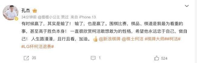 孔杰也发声表示:“有时候赢了,其实是输了! 输了,也是赢了。围棋比赛,棋品、棋道是我最为看重的事,甚至高于胜负本身! 一直很欣赏柯洁敢想敢为的性格,希望他永远忠于自己,做自己! 人生路漫漫,且行且看,加油。”